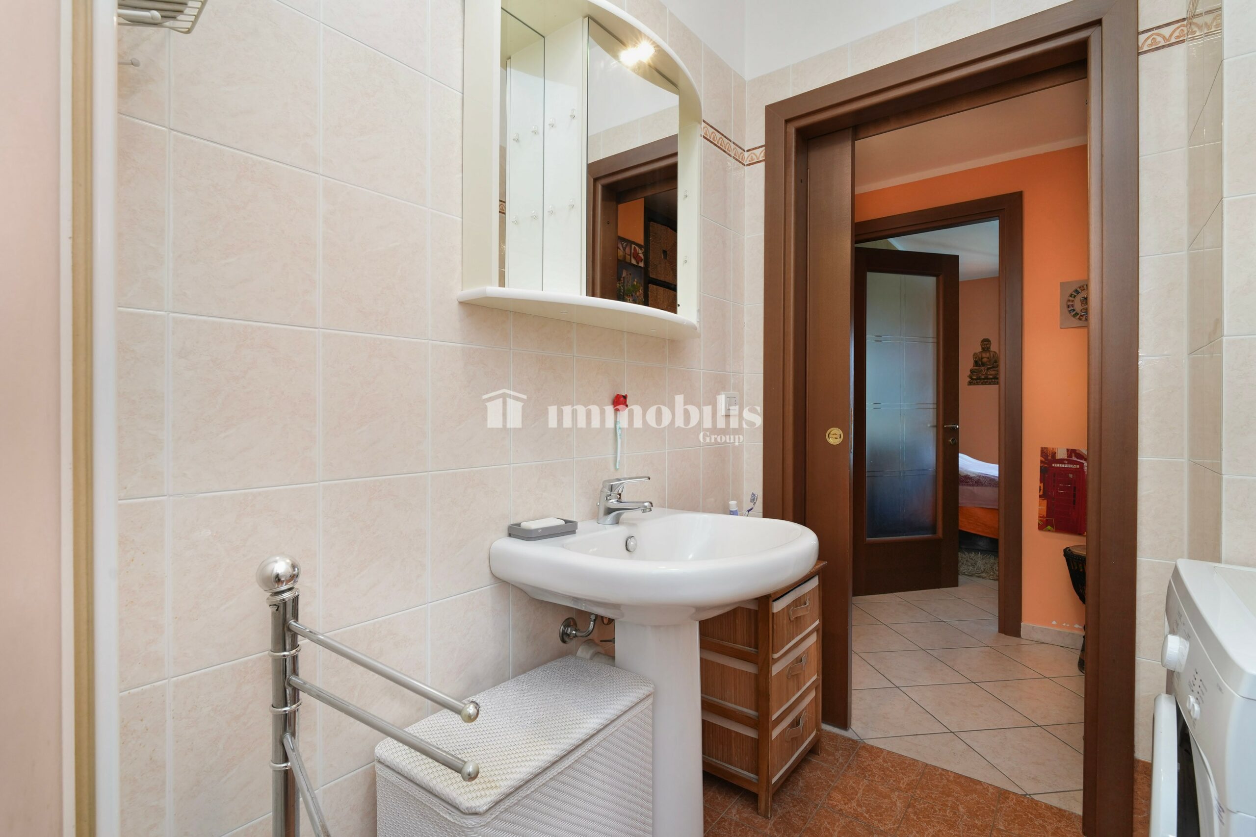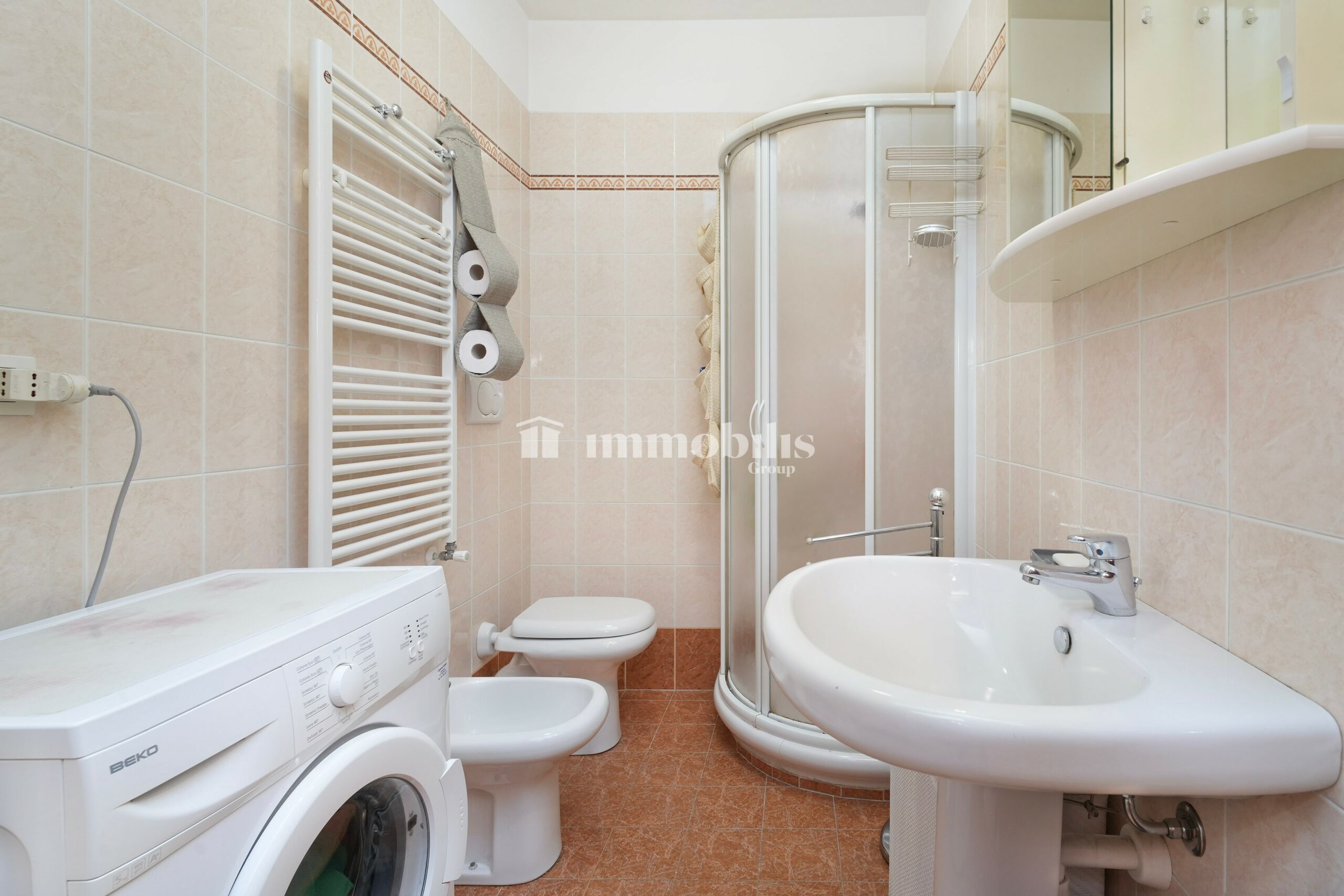 Il bagno, dotato di ventola di aspirazione forzata, dispone di box doccia e spazio dedicato per la lavatrice.