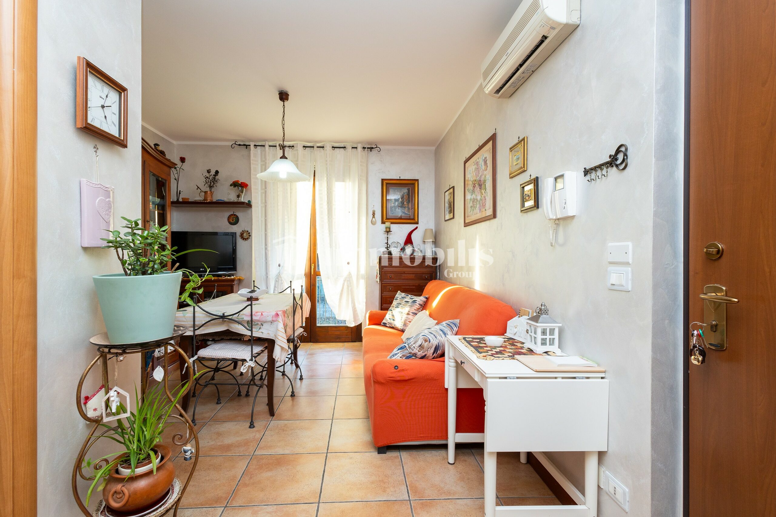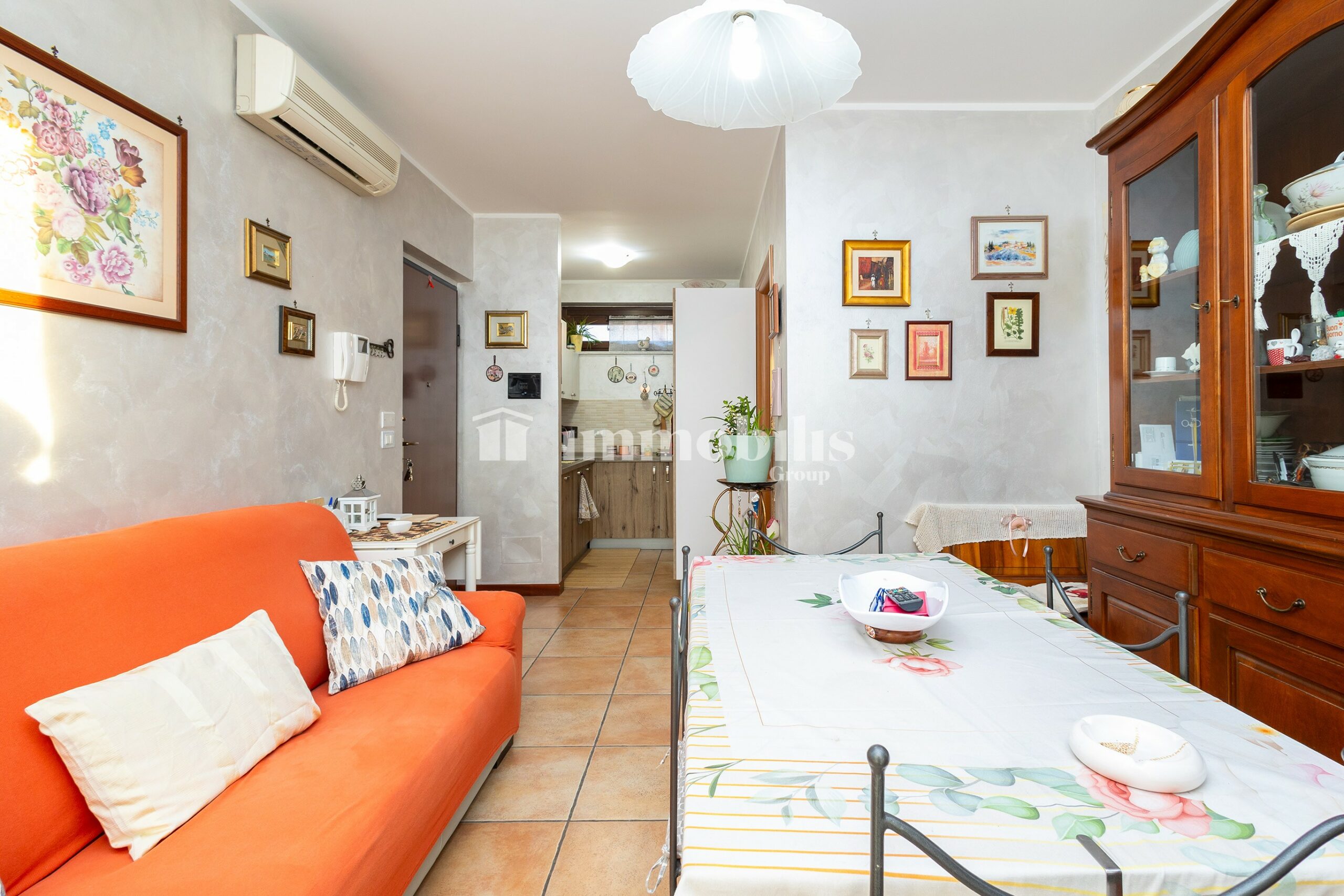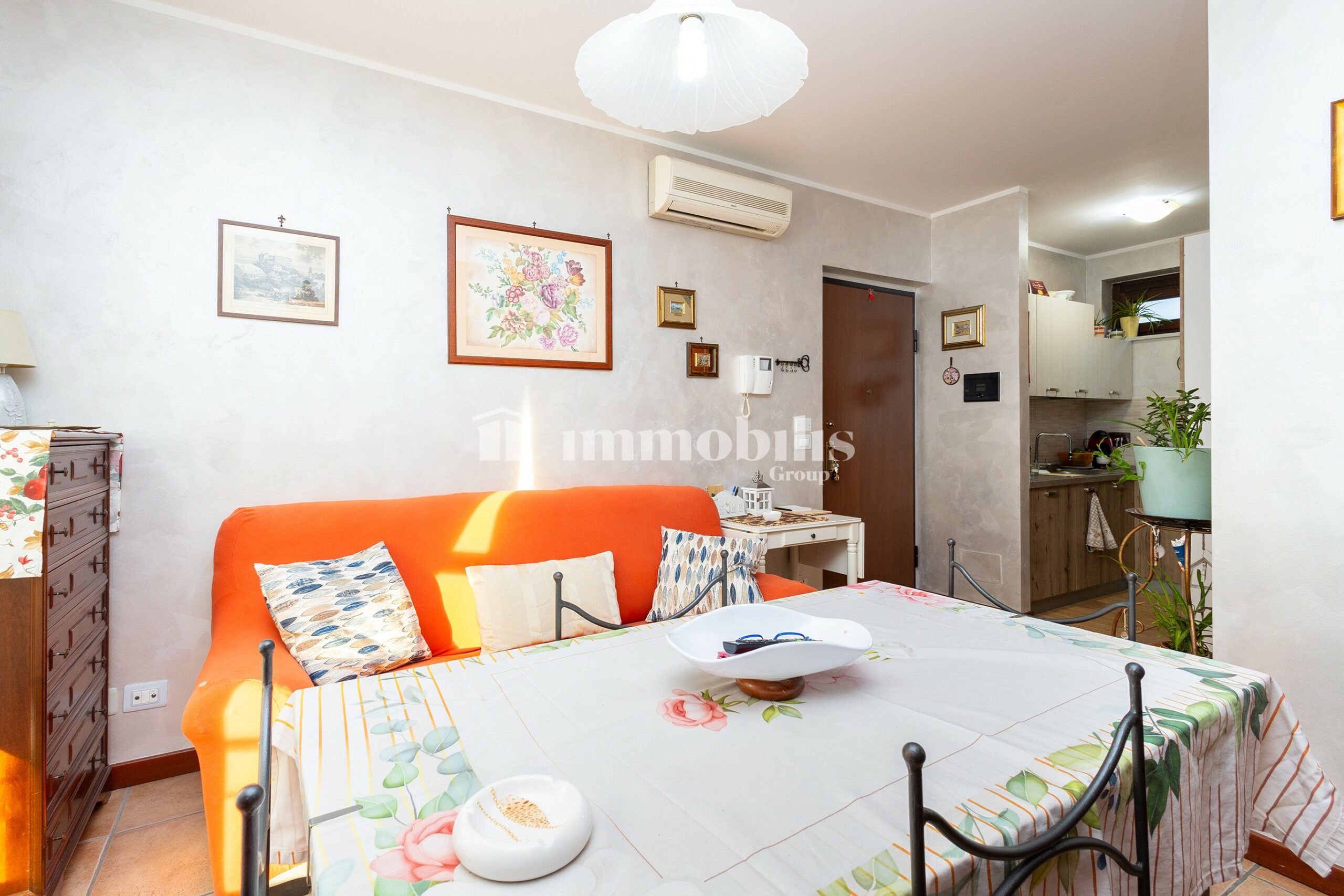 Tramite porta blindata accediamo al salone living che permette di ospitare tv a parete, tavolo da pranzo e divano due posti. Il cucinino è a vista ed è dotato di finestra.