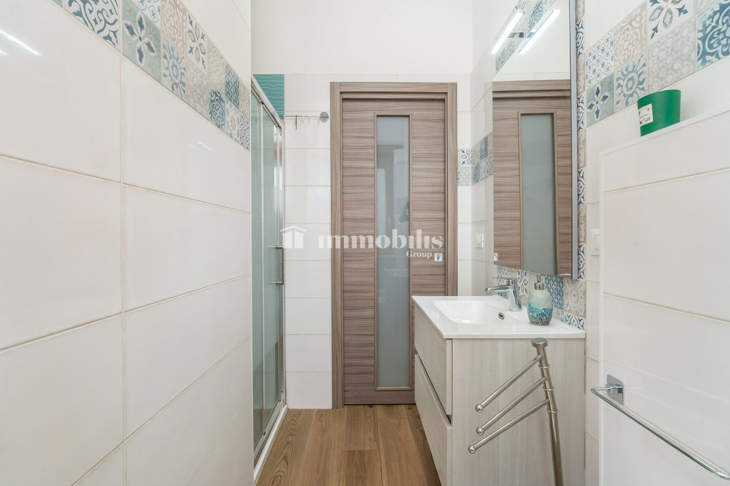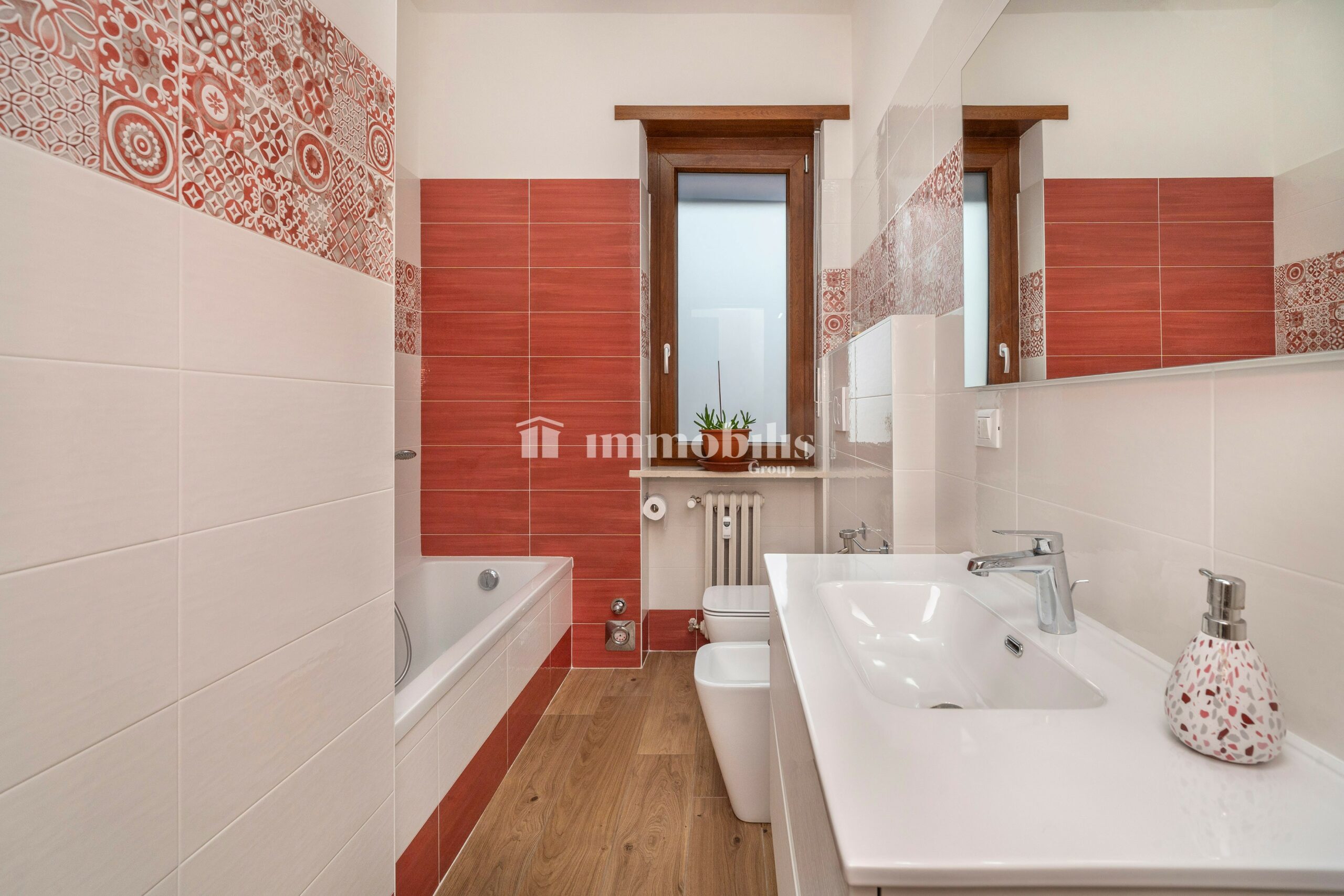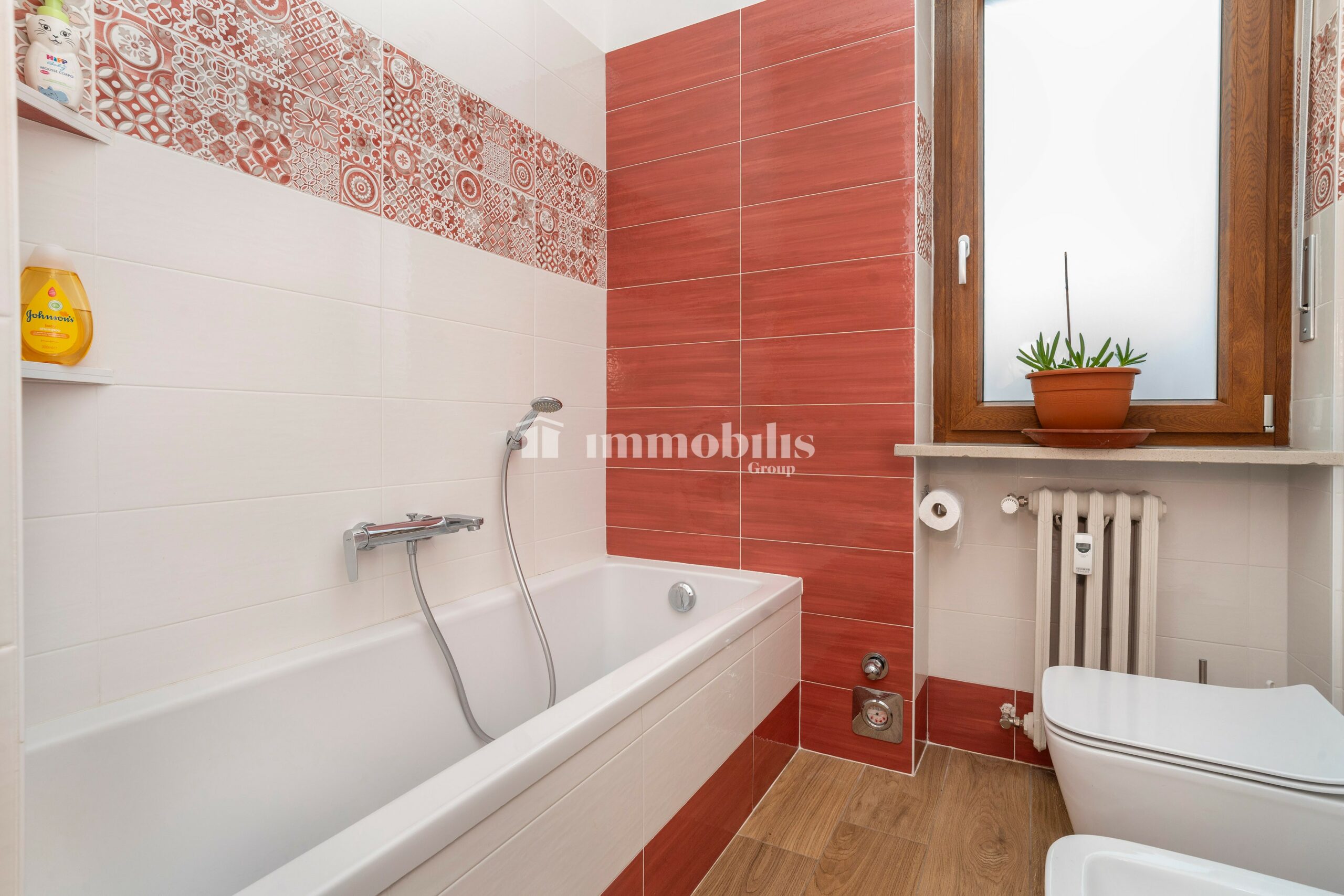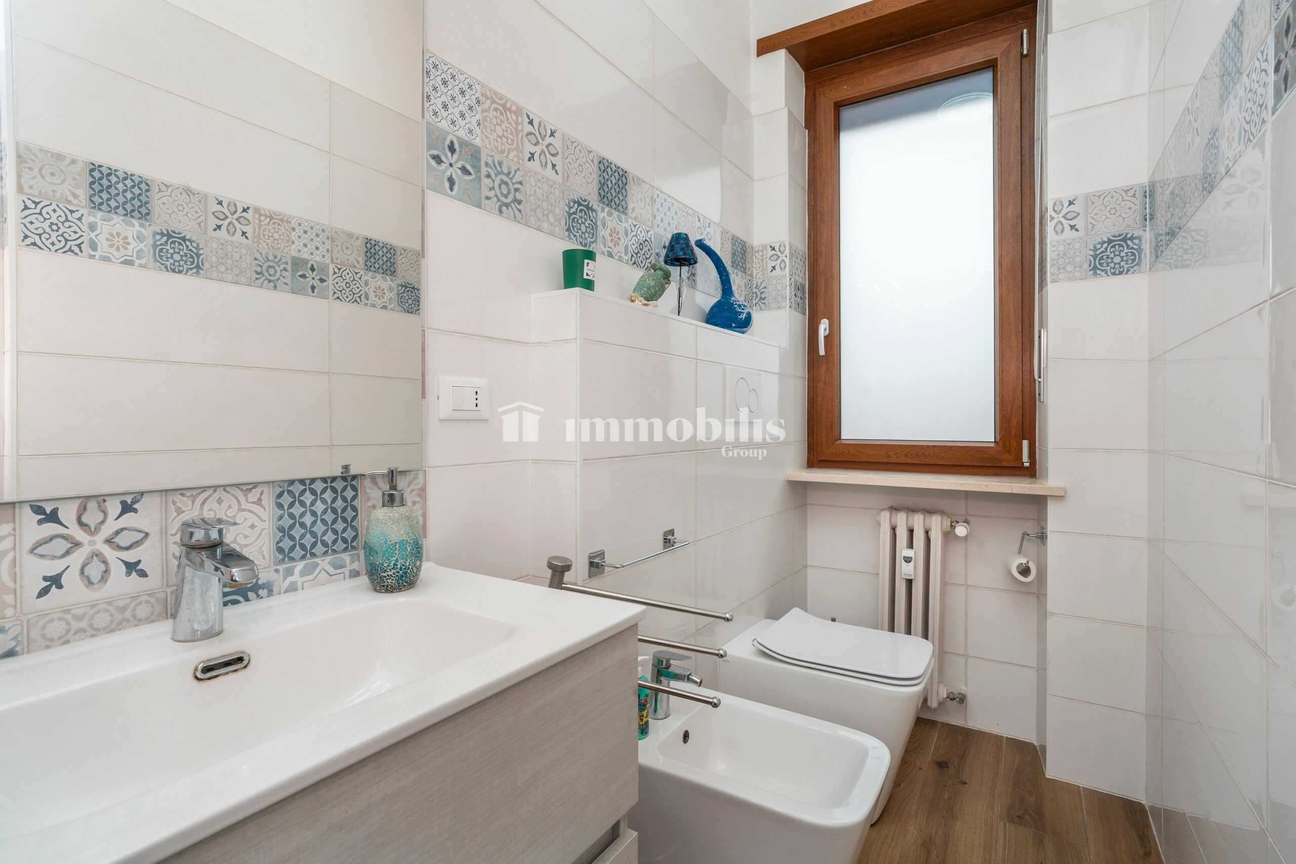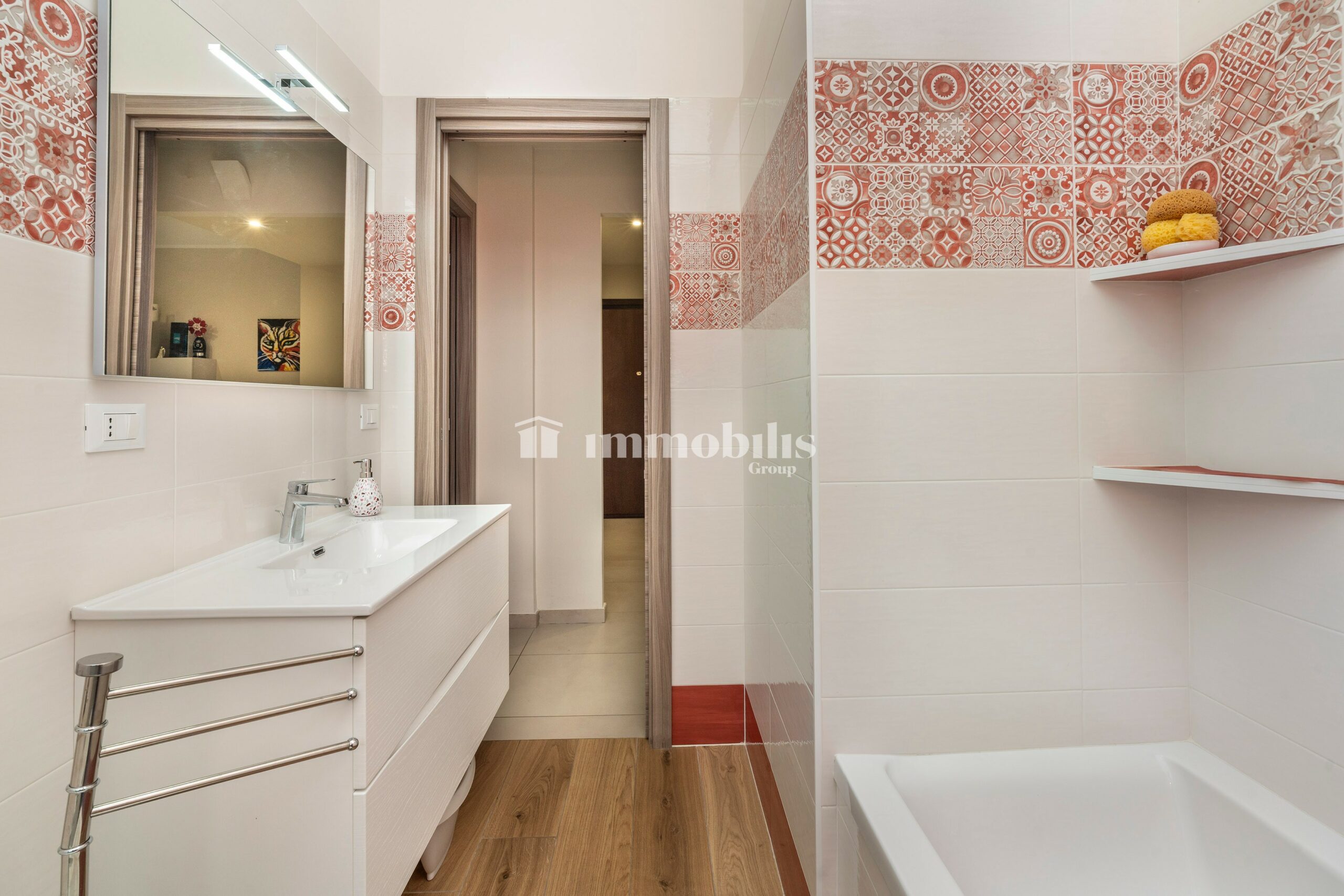 L’appartamento dispone inoltre di doppi servizi entrambi finestrati: uno con box doccia, l’altro con vasca da bagno, perfetti per soddisfare le diverse esigenze quotidiane.