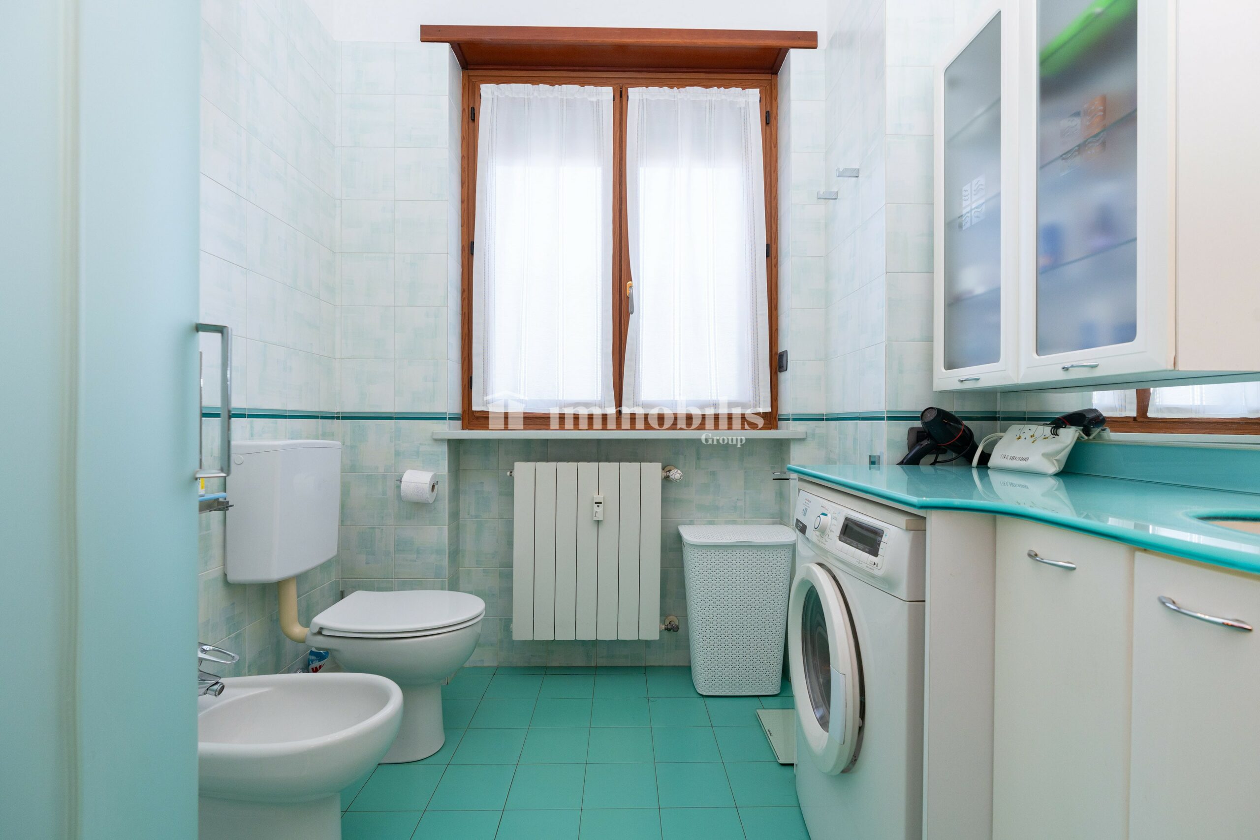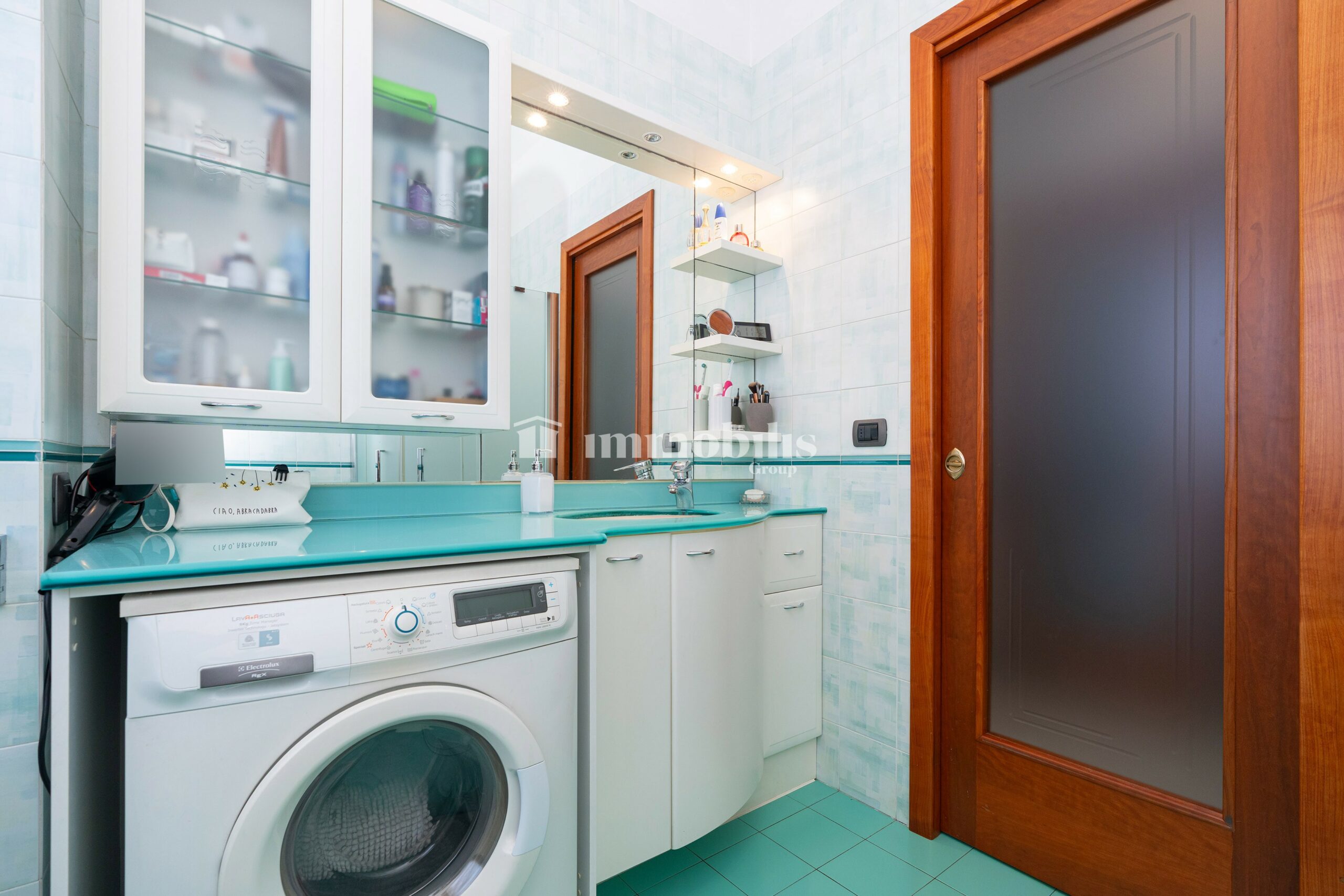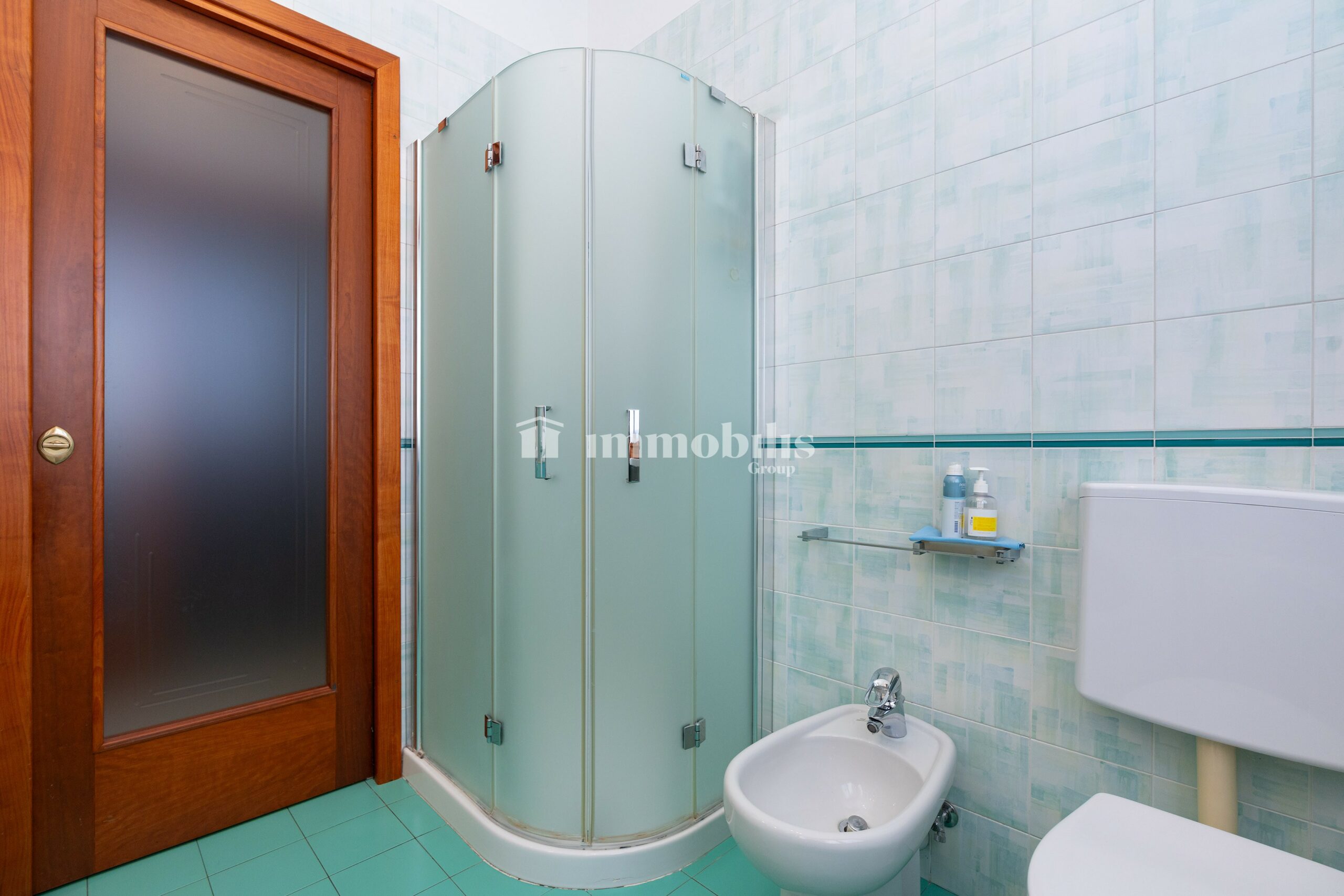 Completa la soluzione un secondo bagno, funzionale e moderno, dotato di box doccia e spazio per la lavatrice.