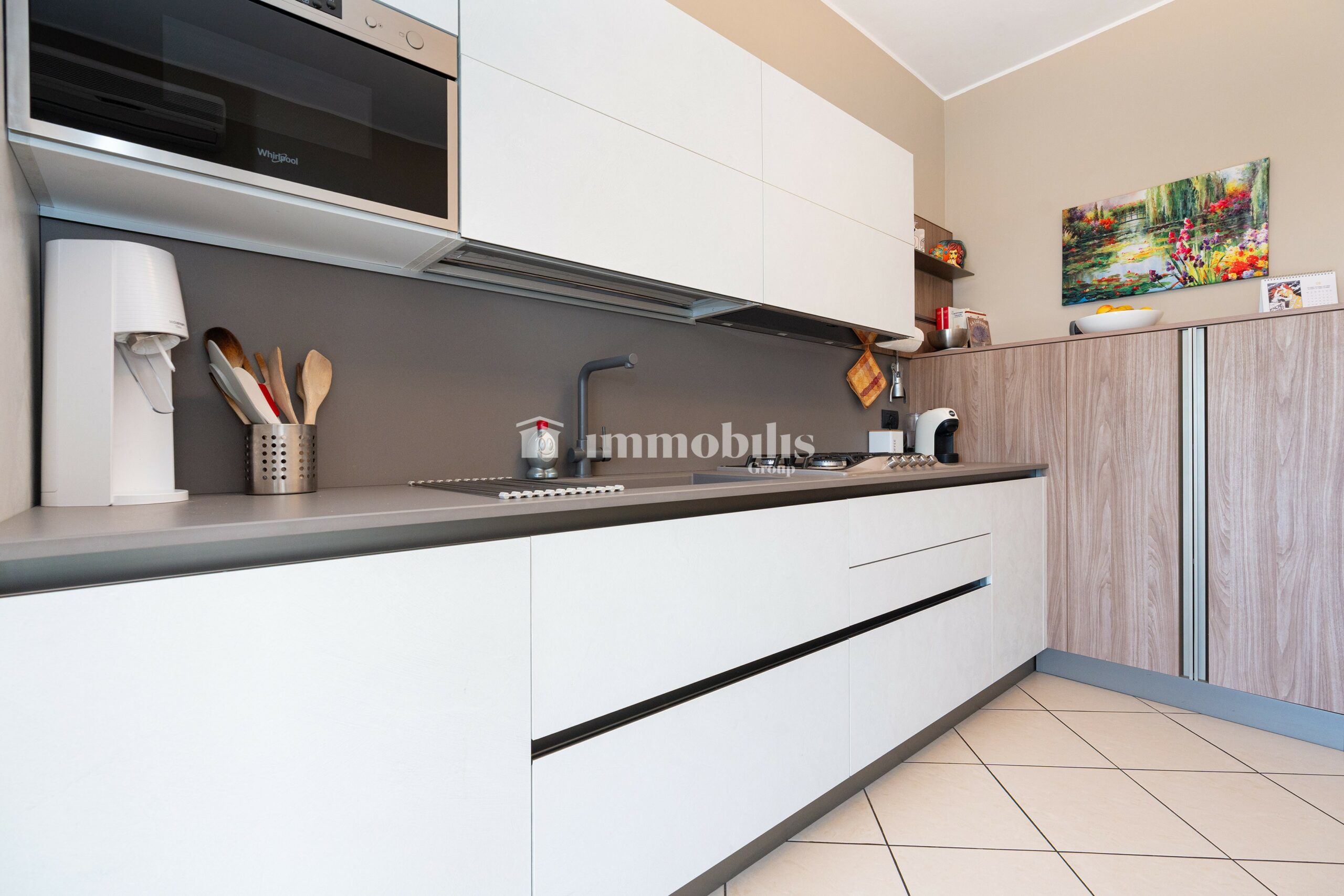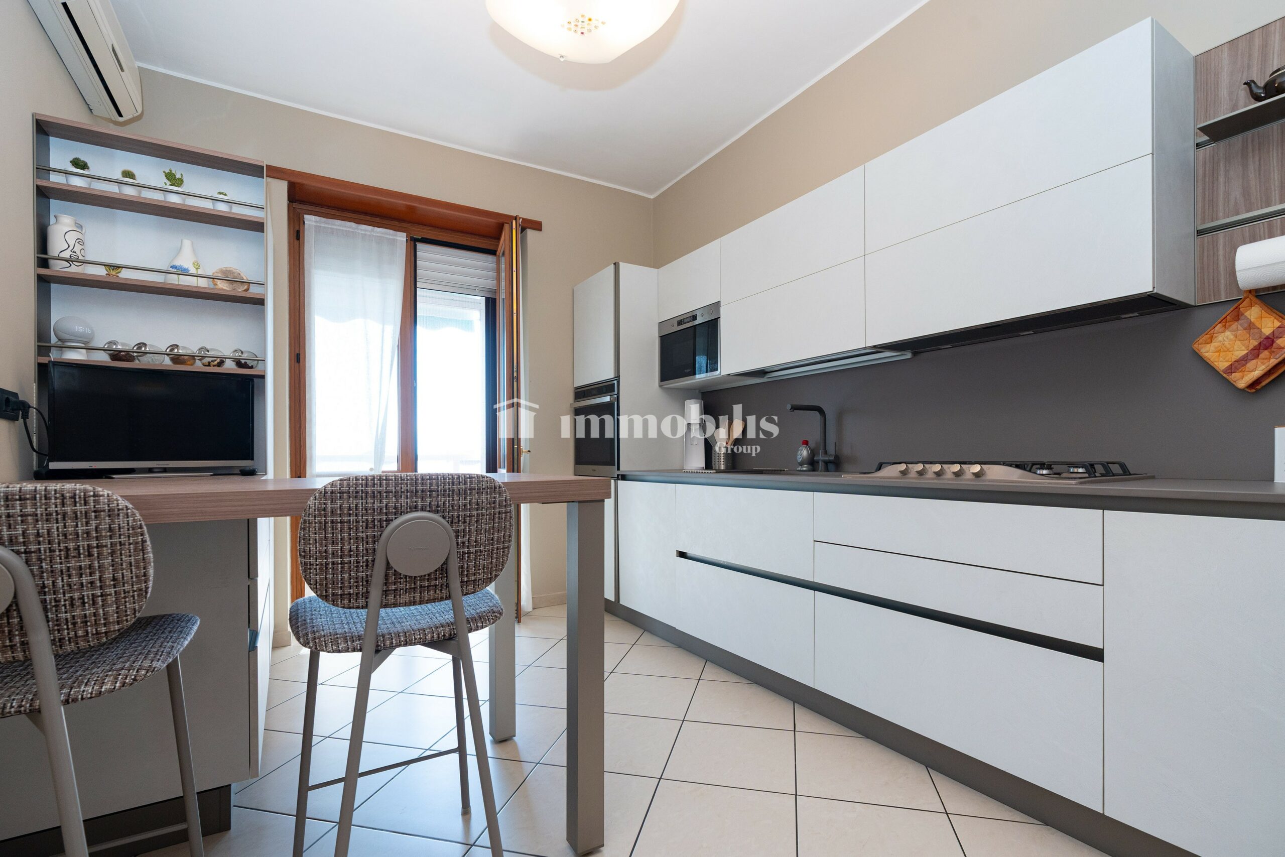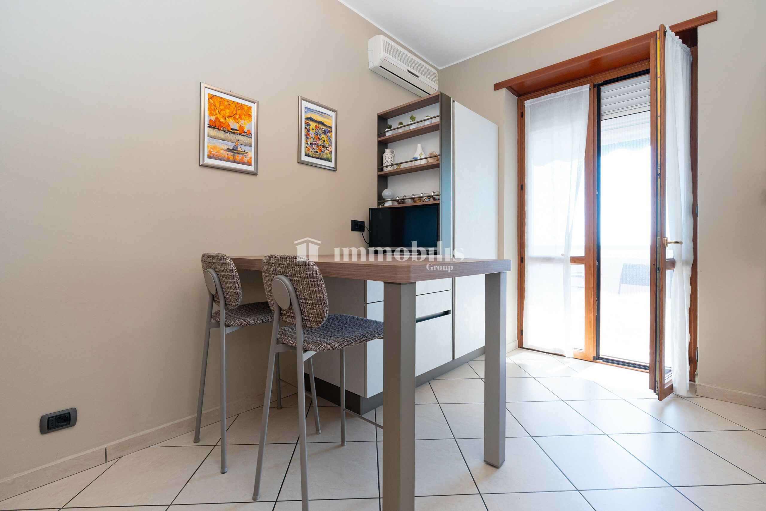 Sulla sinistra troviamo il soggiorno, un ambiente versatile che può essere utilizzato sia come zona living che come sala da pranzo, a seconda delle esigenze. La cucina è abitabile, attrezzata con cucina lineare e arricchita da un comodo banco snack, perfetto per colazioni o pranzi veloci.