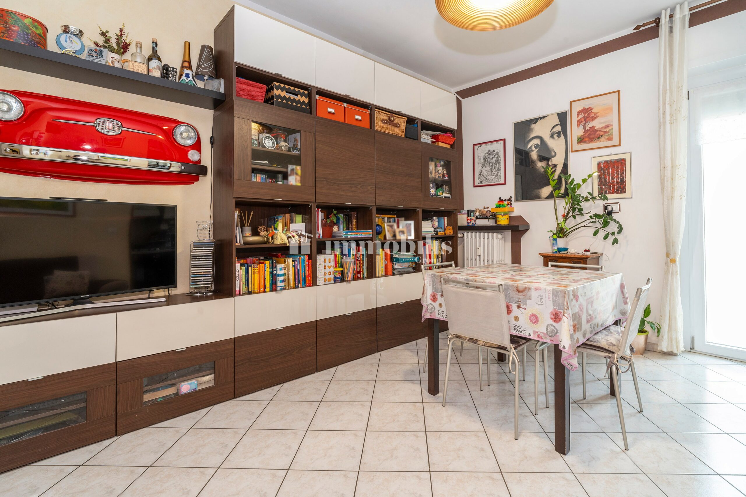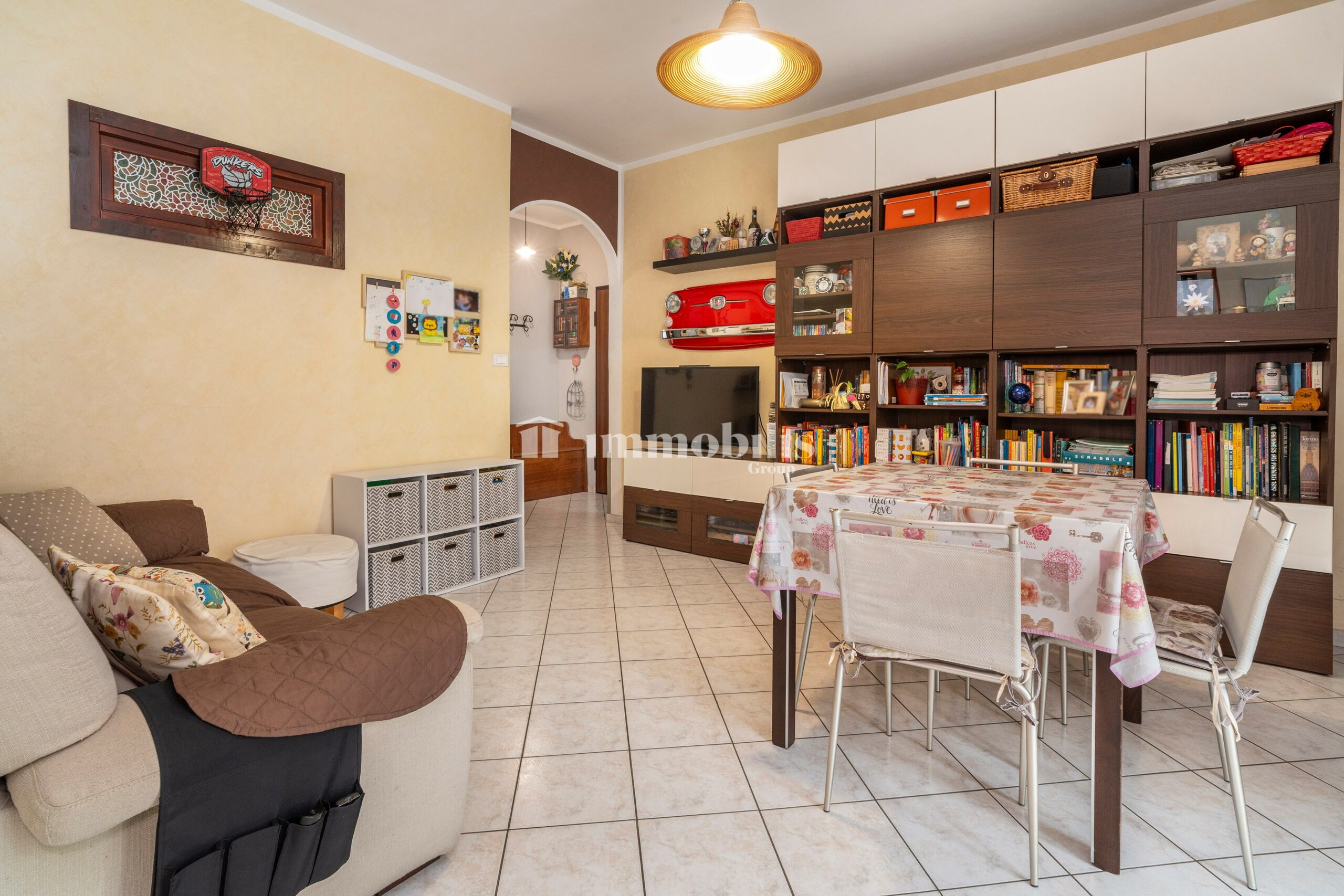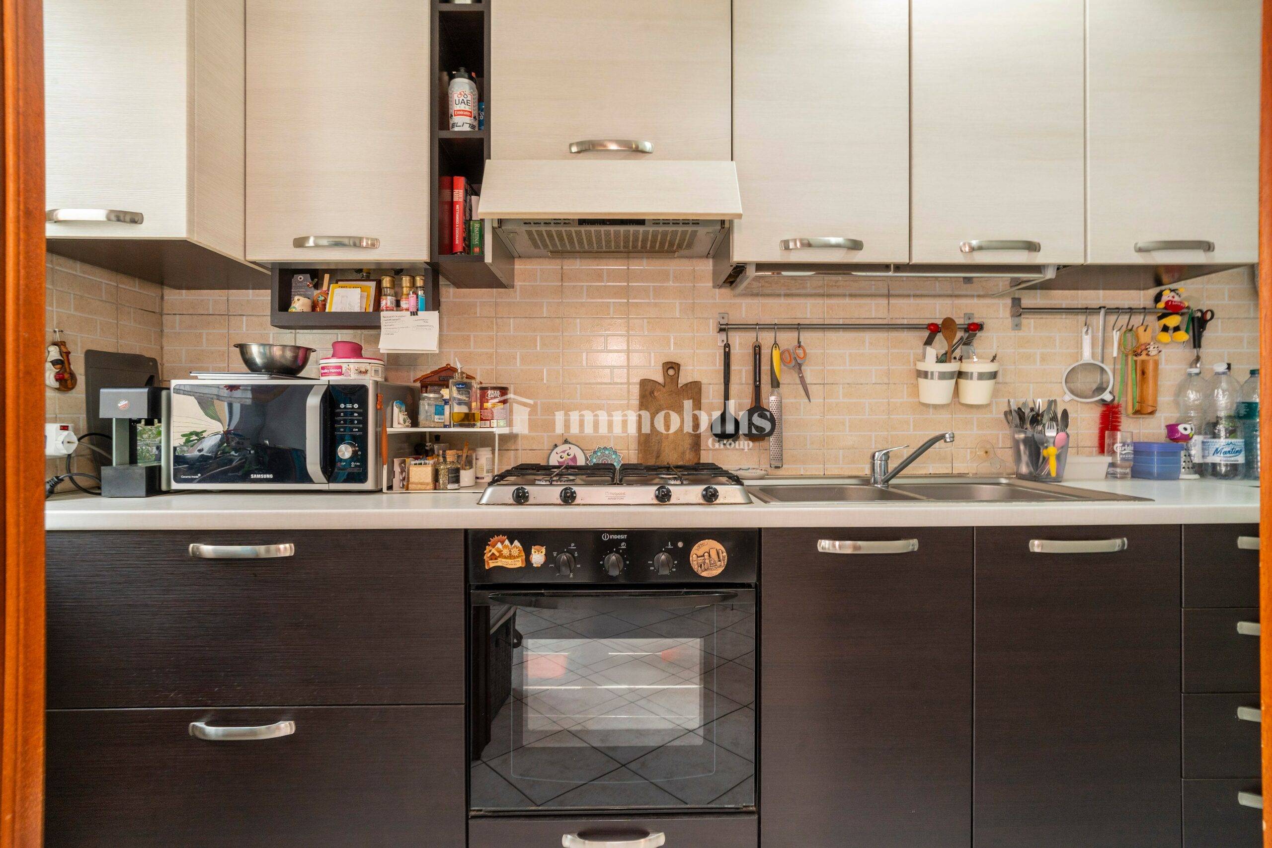 Il soggiorno, di dimensioni generose, è l’ambiente principale della casa: accogliente e luminoso, è arricchito da una cucina lineare a mo’ di cucinotto, integrata in modo discreto ma funzionale grazie all’apertura che separa il tinello dal cucino.