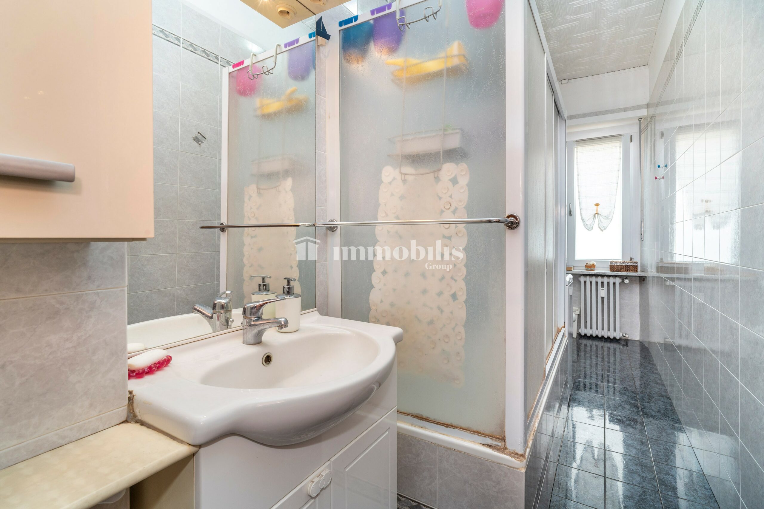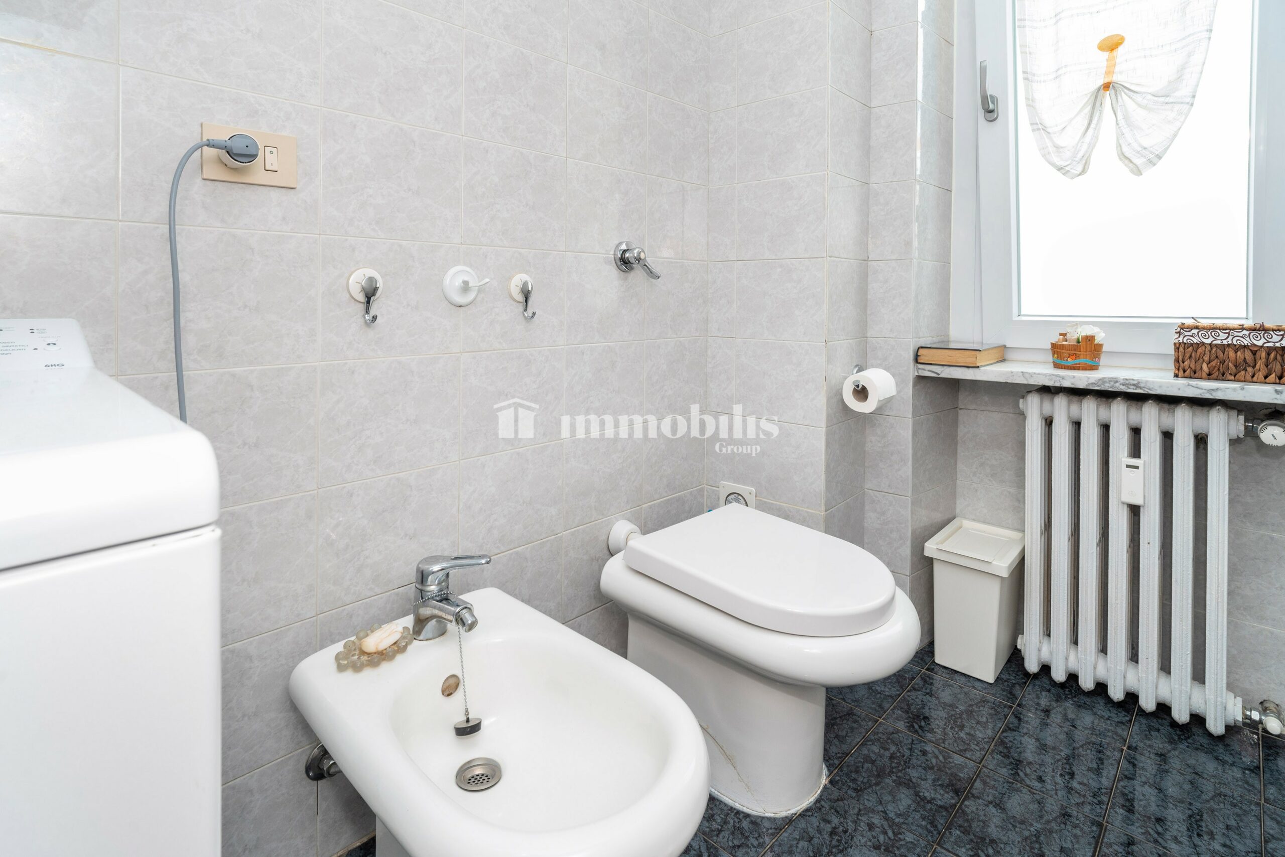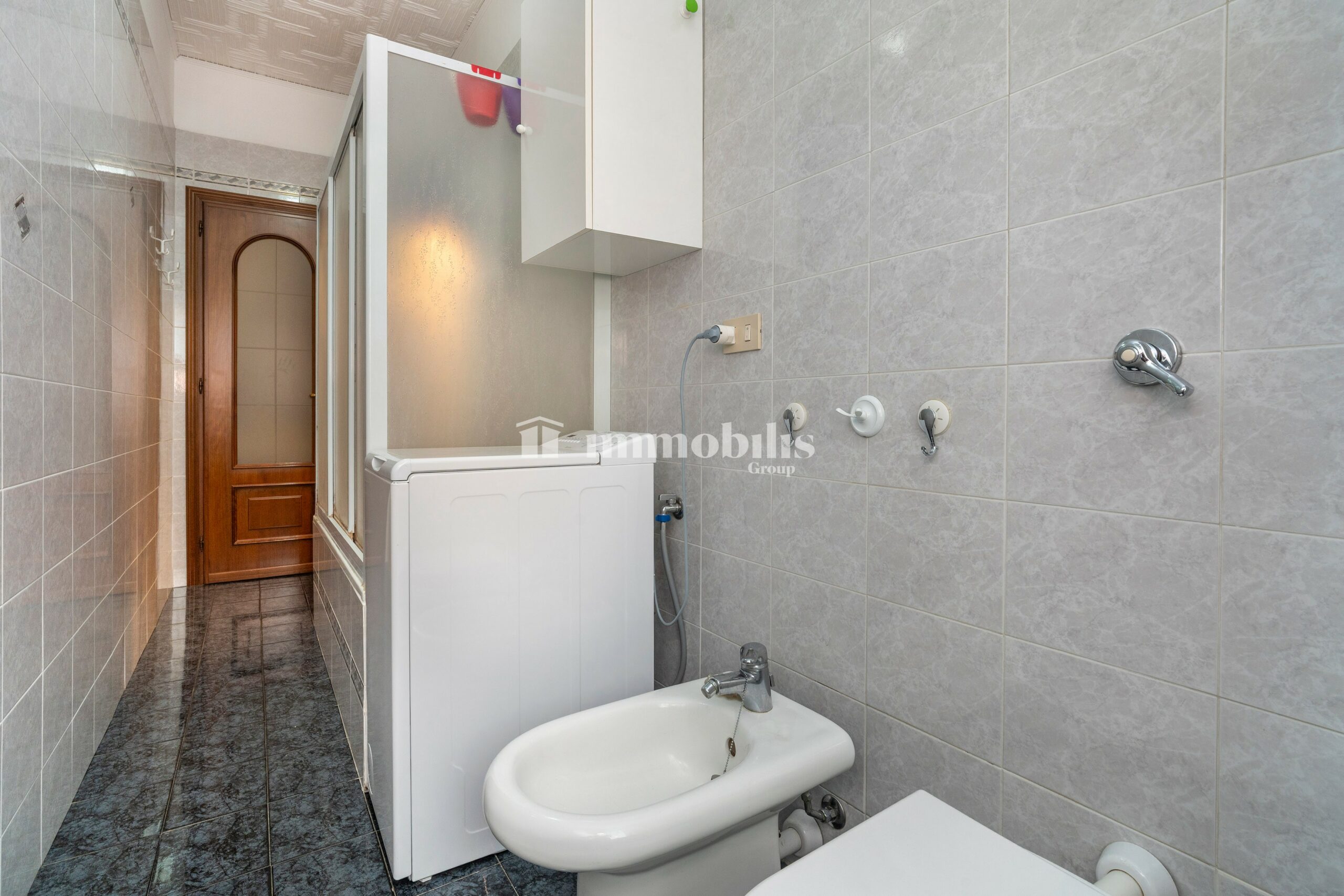 Il bagno è dotato di vasca e attacchi per la lavatrice, con spazi ben gestiti e possibilità di eventuale riammodernamento.